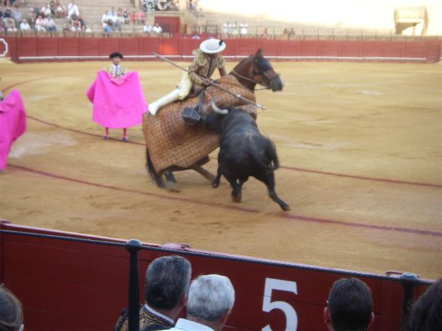 bull charges the horse and the picadores stick him with
