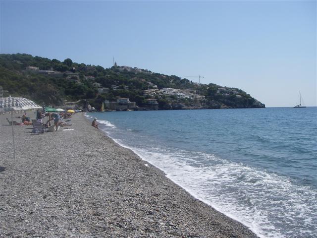 The beach in La Herradura, with Zia at anchor.