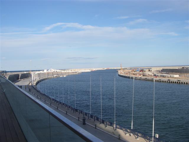 at the rear of the photo. The channel leads into the port
