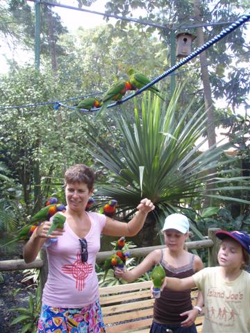 friendly parakeets, a manmade waterfall and flamingo